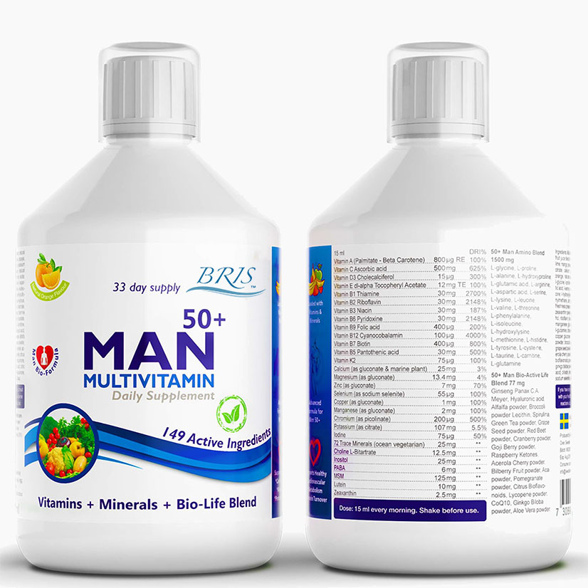 the absorption is easier. The Man 50+ Multivitamin is a bio-advanced formula for men aged 50 and older. It gives you more energy and endurance, healthier muscles and bones and stimulates blood circulation.Dosage: 15 ml in the morning, because it is a drink, the dosage can easily be adjusted.